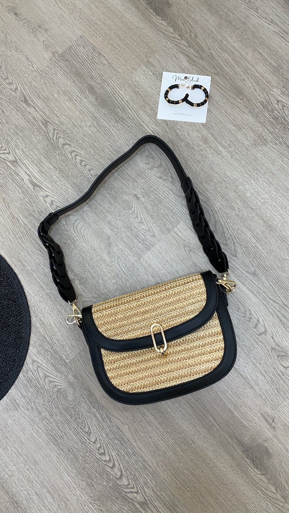 Woven detailing with faux leather and gold tone hardware.