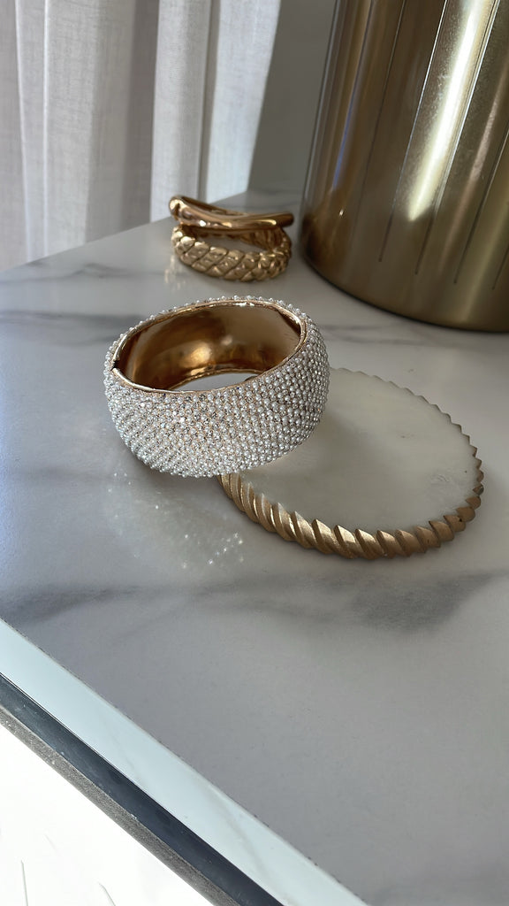 The Mirelle Cuff embodies pure sophistication. A masterpiece of shimmering detail, it features a polished gold interior and a surface wrapped in delicate faux pearls and crystals that catch the light with every movement. Bold yet graceful, this cuff brings timeless glamour to any look — from elegant evenings to holiday soirées.