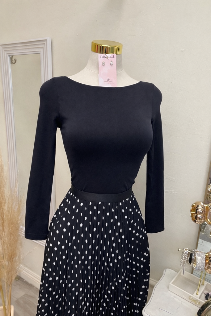 A timeless feminine piece that instantly elevates any outfit. This beautifully pleated polka dot skirt flows effortlessly with every step, creating soft movement and an elegant silhouette. The flattering elastic waistband offers comfortable stretch while the silky waistband detail adds a polished touch. Designed with delicate micro pleats that create a subtle ruffled effect along the hem, this skirt gives you that graceful, airy feel without the bulk of traditional ruffles.