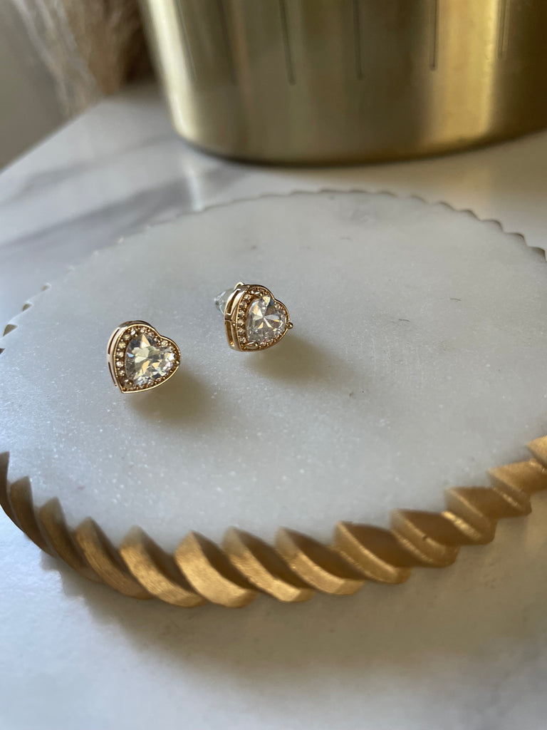 The Amore Crystal Studs feature a brilliant heart shaped center stone framed with delicate crystal detailing in a polished gold tone setting. Small yet eye catching, these studs add the perfect touch of shine to both everyday outfits and special occasions.