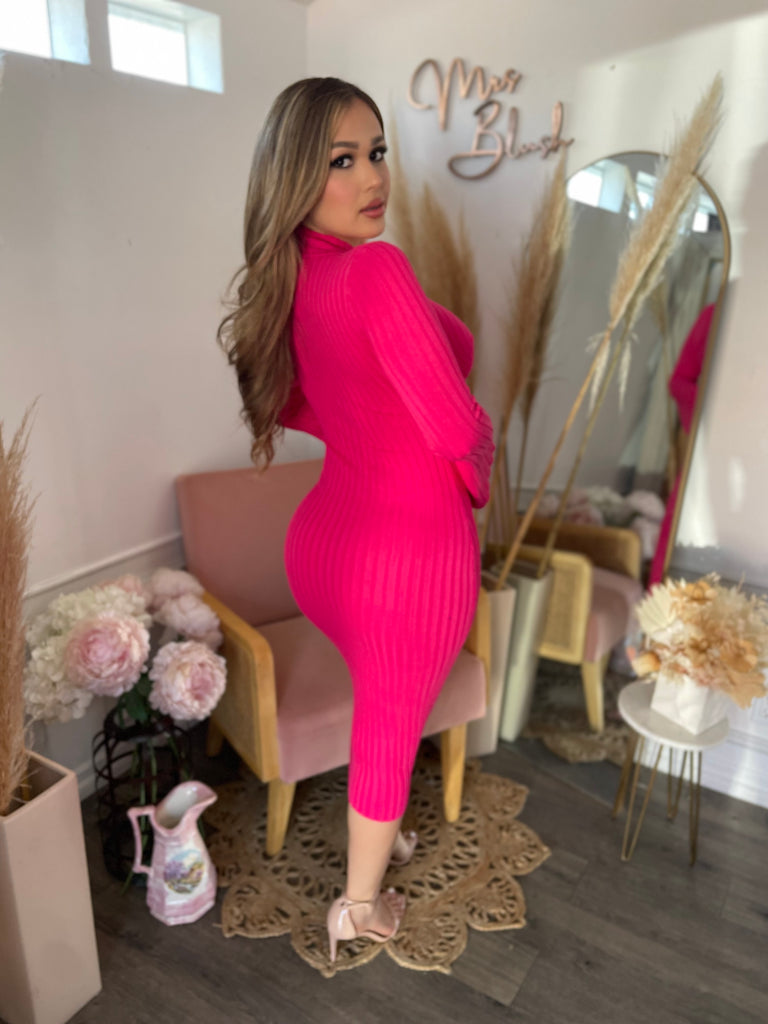Meet The Aria Dress — your new show-stopping statement piece. Designed in a bold fuchsia hue, this ribbed, body-hugging midi blends sophistication with confidence. The sheer midsection and sculpted bust design highlight your curves while keeping the look refined and elegant. Perfect for date nights, celebrations, or any moment you want to stand out beautifully.