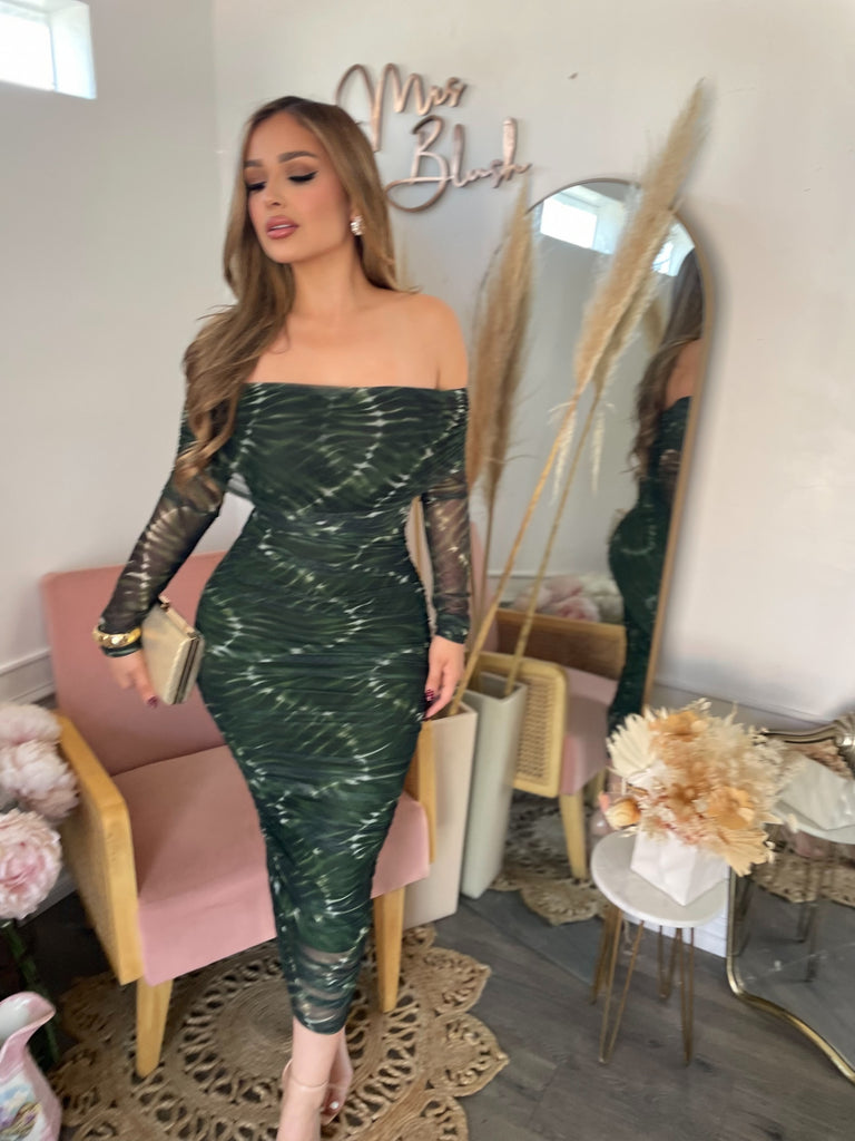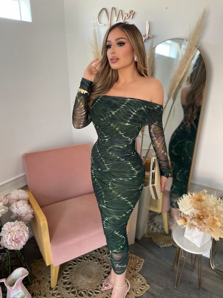 Mysterious, bold, and unforgettable — The Enigma Midi is designed to captivate from every angle. This off-shoulder silhouette features a soft stretch mesh that feels incredible on the skin while hugging every curve in the most flattering way. Its ruched detailing and sheer long sleeves create a dreamy, form-sculpting look that exudes quiet confidence and allure