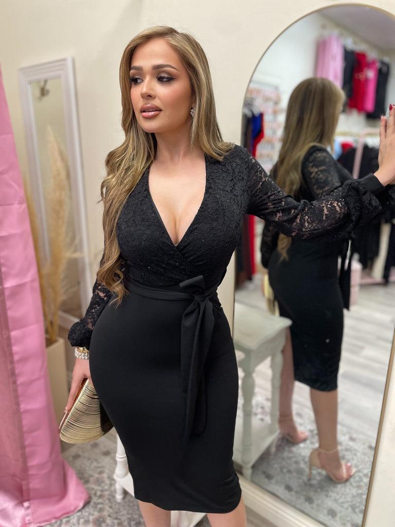 A timeless statement piece designed to command attention. The Femme Noir Dress blends romance and power with its delicate lace long sleeves and flattering wrap style neckline. The structured midi skirt hugs your curves beautifully while the self tie waist belt defines your silhouette for a polished, confident finish. Elegant enough for evening events and refined enough for work functions, this dress transitions effortlessly from office to after hours.