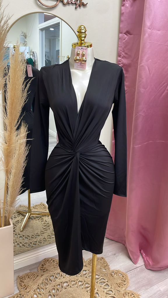 This midi is the definition of effortless luxury. The soft stretch fabric hugs your curves in all the right places, while the deep V neckline and gathered draping create a snatched, feminine silhouette. The twist-knot waist detail shapes the body beautifully, giving you that hourglass look without sacrificing comfort. Perfect for fall events, dinner nights, holiday parties, or any moment you want to feel classy and confident.