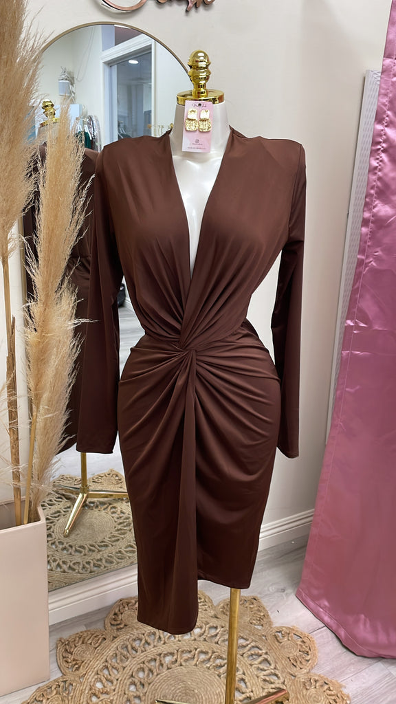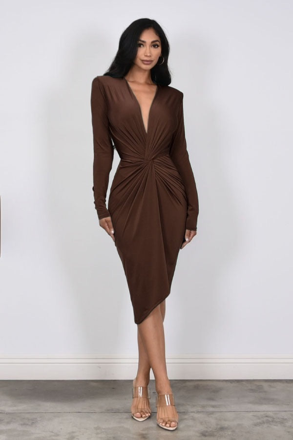 This rich chocolate midi is the definition of effortless luxury. The soft stretch fabric hugs your curves in all the right places, while the deep V neckline and gathered draping create a snatched, feminine silhouette. The twist-knot waist detail shapes the body beautifully, giving you that hourglass look without sacrificing comfort. Perfect for fall events, dinner nights, holiday parties, or any moment you want to feel classy and confident.