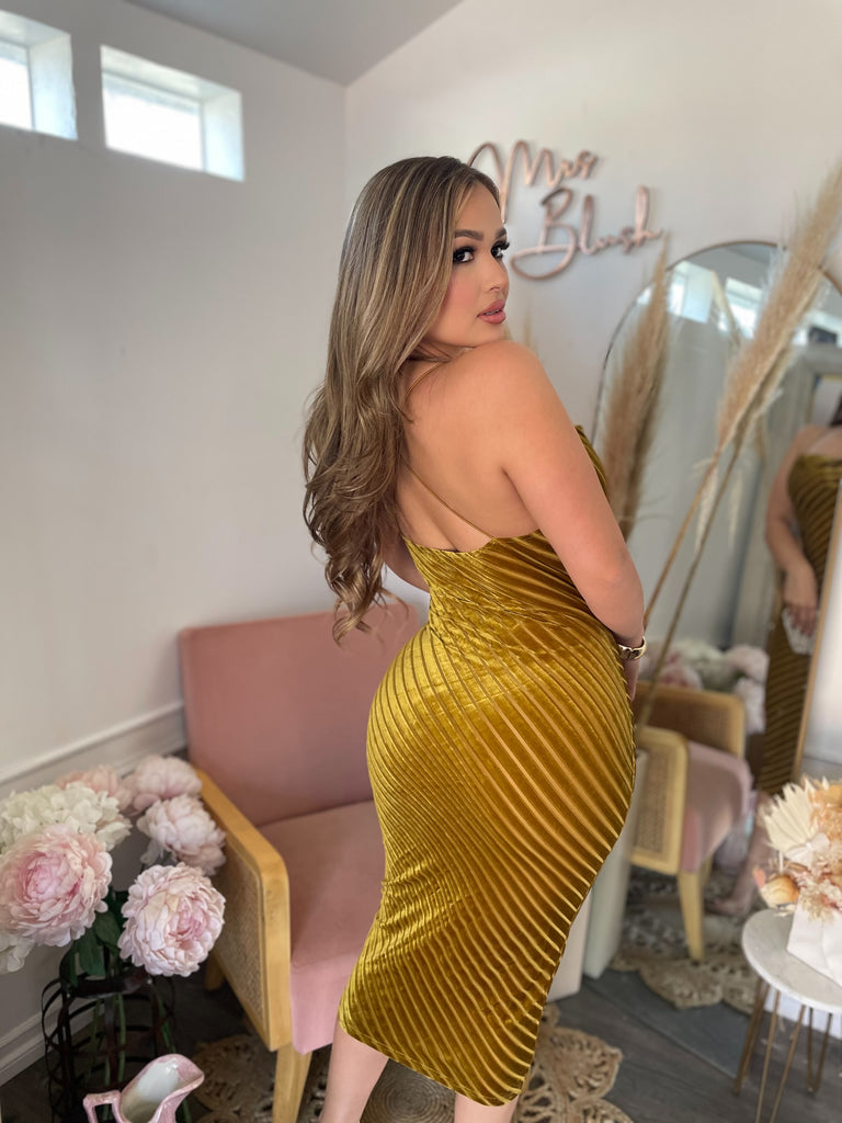 Elegant and magnetic, The Midnight Aura Dress captures the essence of nightfall in rich ribbed velvet that glimmers under the light. Designed with a flattering cowl neckline, delicate straps, and great stretch that hugs every curve in comfort, it’s the perfect blend of sophistication and allure for your next evening out.