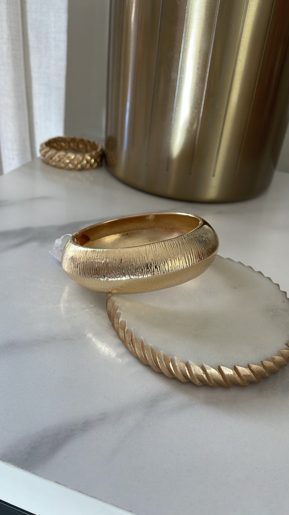 The Solenne Cuff embodies understated sophistication. Crafted in a warm gold tone with a subtle brushed texture, it reflects a soft, luminous glow that feels refined and effortless. Its sculpted shape makes it a modern essential — perfect for stacking or wearing solo as a statement of quiet confidence.