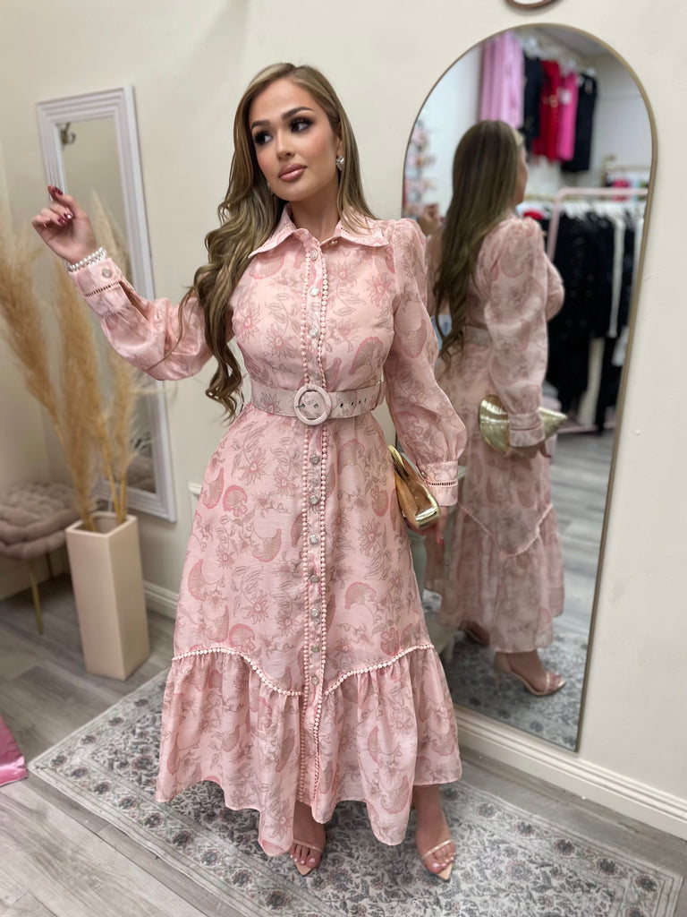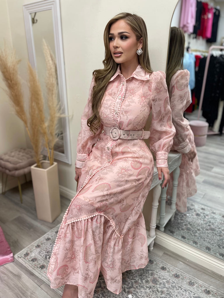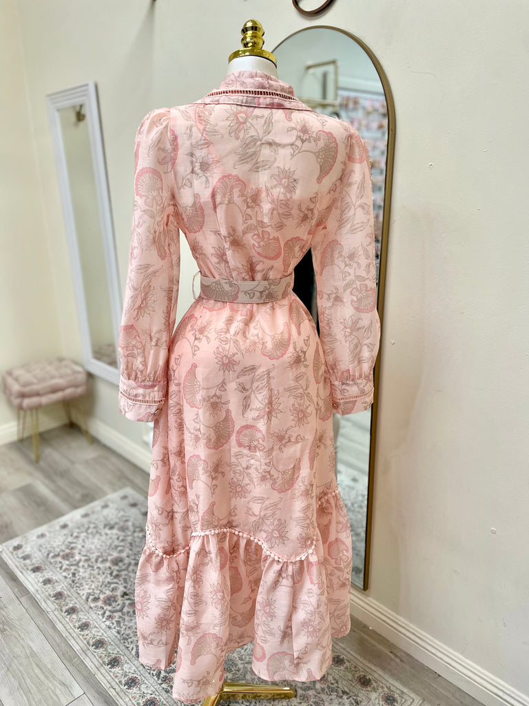 Designed with delicate flower and taupe detailing on a creamy blush base, this romantic silhouette features a structured collar, a fully functional button front, and a matching adjustable belt that defines your shape beautifully. There is no zipper, simply button it up and style it your way.